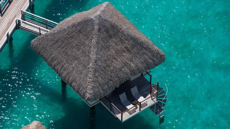 2畳分のガラス床が設置された水上バンガローですが、2畳分という大きさはもちろんタヒチ最大。ガラス張りの床ごしに色とりどりの魚たちを鑑賞できますよ。昼間は水色の淡い光が部屋中を覆い、夜はライトに魚が集まって、また幻想的な雰囲気を醸し出しています。お部屋に入った瞬間、足元に広がるクリスタルブルーの海とトロピカルな魚たちの美しさに、このリゾートを選んで良かったと実感するはずでしょう。